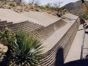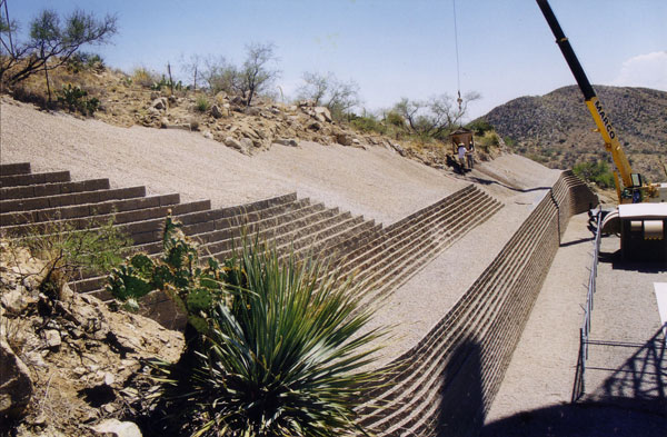 Mechanically Stabilied Earth Retaining Walls - Low impact wall construction. No concrete or reinforcing steel used. Can be Built with unskilled labor and hand tools. Large walls are built at a fraction of cost of comparable solid masonry walls. Layers of geosynthetic fabric laid between layers of compacted earth. Block, rock, wood or fabric can be used as the wall facing.